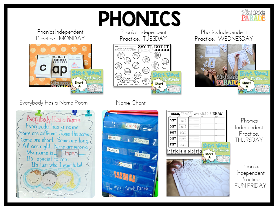 After we’ve warmed up, we do a quick whole group lesson. That’s where the direct, explicit instruction takes place. That is necessary before moving onto independent practice. I have to teach before I can expect them to do. All of the independent activities pictured above are in my Short Vowel Ventures – Short A packet.