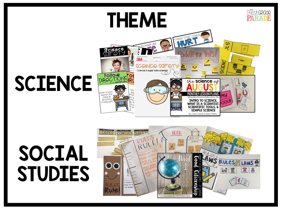And then we finish out the day with Theme…aka – Science and Social Studies. Here’s what that looks like visually, but you can take a closer peek in the plans. Just download them HERE.