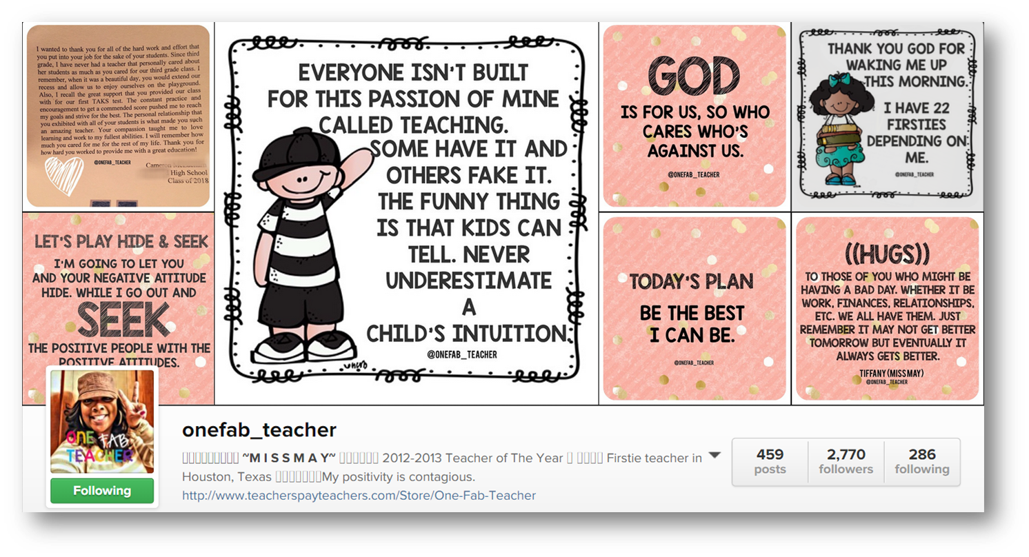 Let’s start with someone to follow. Are you on Instagram?? If you are and by some chance you’re not following Miss May at One Fab Teacher, do yourself a favor and follow. I absolutely LOVE her posts. They are always SO positive! In a profession where it’s easy to let the worst get the best of you, Tiffany is a bright spot in every day. Her positivity is contagious! I just LOVE her! And she’s a Houston girl, so she had my heart right away 😉