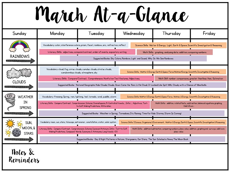 Rainbows/Color Science, Clouds, Weather in Spring, and Sun/Moon Stars. That’s a mouthful! Here’s the pacing calendar for those of you who asked…