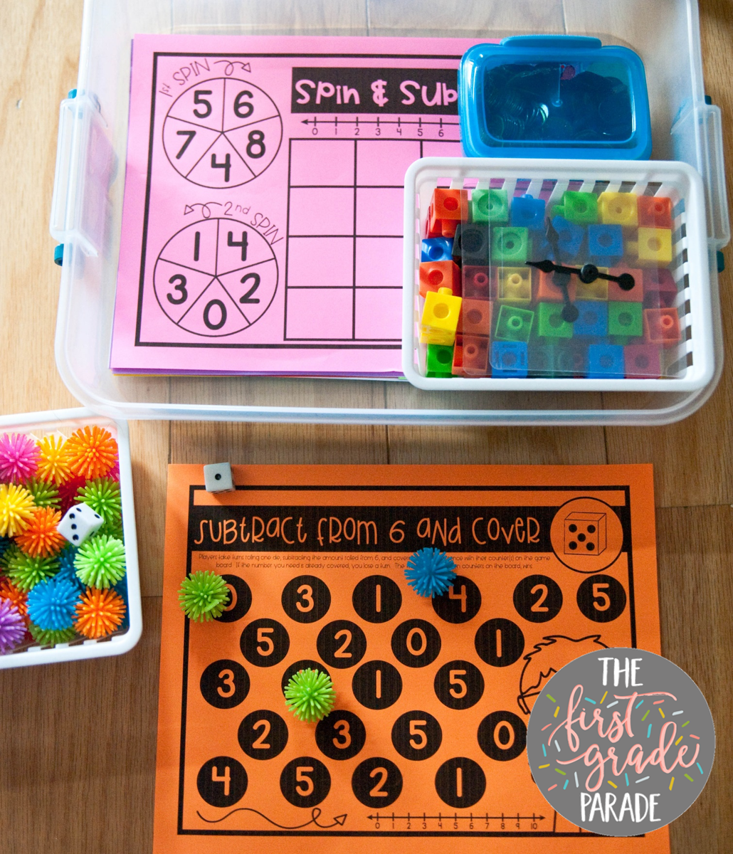Here’s my Place Value & Base 10 Block skill based game container. I placed 3 different activities in this container that require the use of the oversize dice, expo marker, base 10 blocks, and additional counters (in the blue snap top container). I can easily place this in it’s entirety on the math shelf and my kids have all the items they need to successfully complete the activities & play the games in one handy little container.