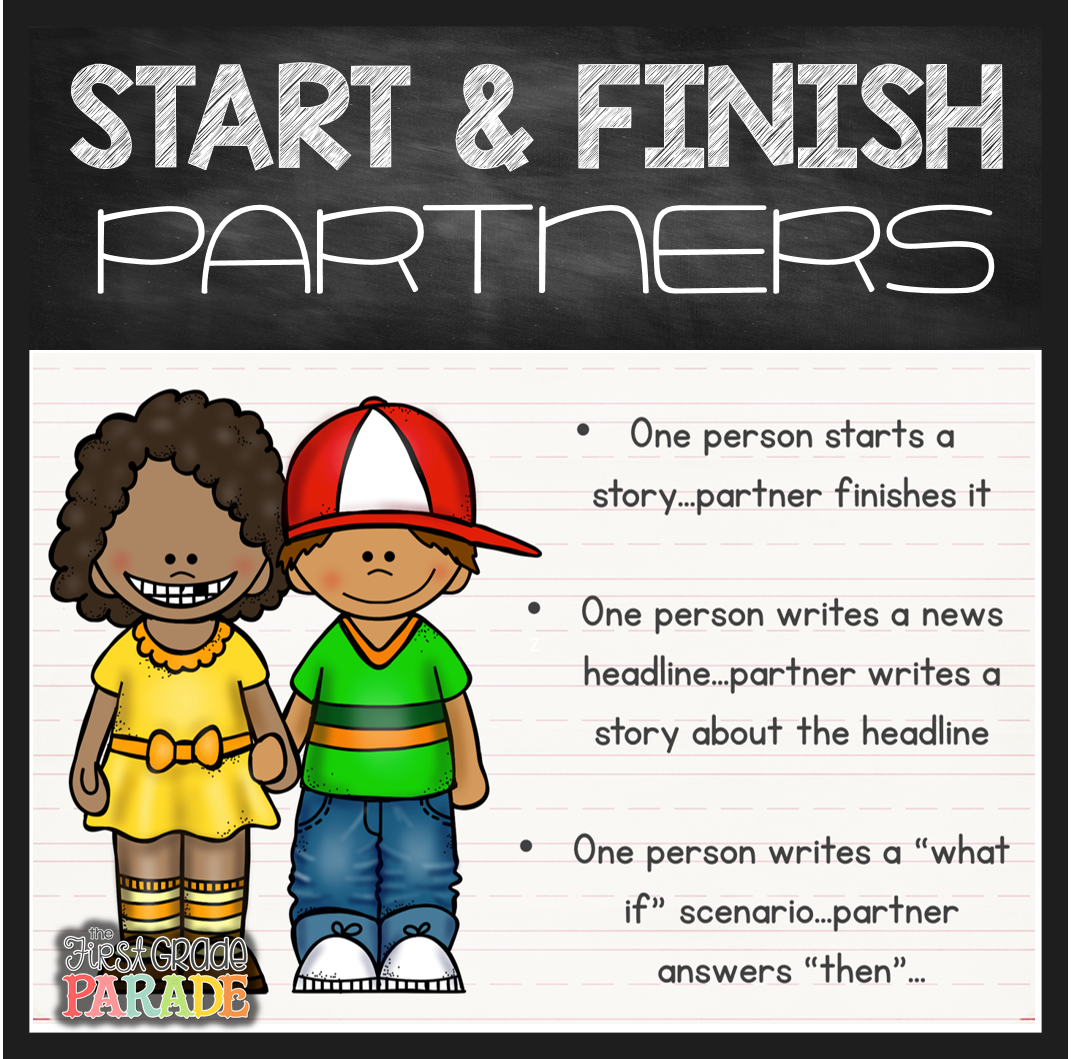 Last but not least, I wanted to share with you a partner writing activity I share in my creative writing sessions. Start and Finish partners!!! Oh how I LOVE this activity to encourage kids to write creatively. One partner starts the story, the other partner finishes it. I’ve included a few start/finish scenarios below. My kids love when I let them do this. This isn’t an everyday activity, but I’ll have them work with a start/finish partner a few times a month and they look forward to it like you wouldn’t believe. This makes a great anchor activity (fast finisher), too!